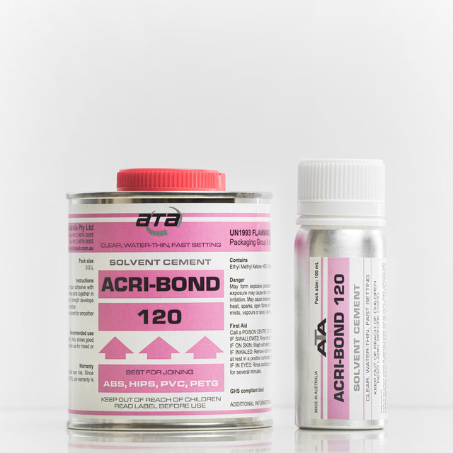 Acri-Bond 120 Solvent Cement is primarily used for bonding ABS, HIPS, PVC and PETG to itself. You only need a bottle or syringe applicator and 0.5mm (Blue) or 0.6mm (Pink) Blunt Needles to be able to use it effectively like the professionals. Acri-Bond 120 is a solvent adhesive where it fuses the two plastic surfaces together providing a strong bond that other ABS, HIPS, PVC and PETG Glues cannot achieve. Acri-Bond 120 ABS, HIPS, PVC and PETG glue is clear and water thin. It has a high initial bond and once allowed to set becomes a powerful bond between the two substrates.